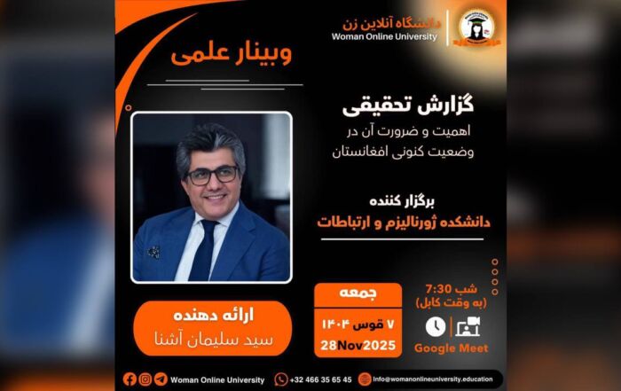 وبینار علمی: موضوع: گزارش تحقیقی (اهمیت و ضرورت آن در وضعیت کنونی افغانستان) ارائه دهنده: سید سلیمان آشنا برگزار کننده: دانشکده ژورنالیزم و ارتباطات پلتفرم: گوگل میت گزارش تحقیقی امروز یکی از نیازهای اساسی [...]