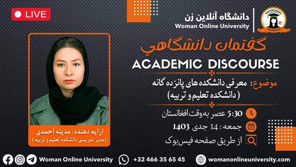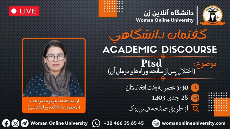 sahar joyan2025-01-17T06:34:18+00:00دانشگاه آنلاین زن با افتخار اعلام میدارد که برنامه آنلاین گفتمان دانشگاهی تحت عنوان PTSD ( اختلال پس از سانحه و راه های درمان آن) را برگزار میکند. مهمان برنامه: عزیزه صراحت (محصل دانشکده روانشناسی) زمان برگزاری: ۲۸/ جدی/ ۱۴۰۳، جمعه ساعت: ۵:۳۰ عصر به وقت افغانستان ساعت: ۲:۰۰ بعد از ظهر به وقت اروپا ساعت: ۸:۰۰ صبح به وقت آمریکا محل برگزاری: از طریق صفحه فیسبوک دانشگاه آنلاین زن در این گفتمان بانو عزیزه صراحت (محصل دانشکده روانشناسی) در مورد ptsd اختلال پس از سانحه و راه های درمان آن خواهد پرداخت لذا از تمام دانشجویان و علاقمندان دعوت [...]