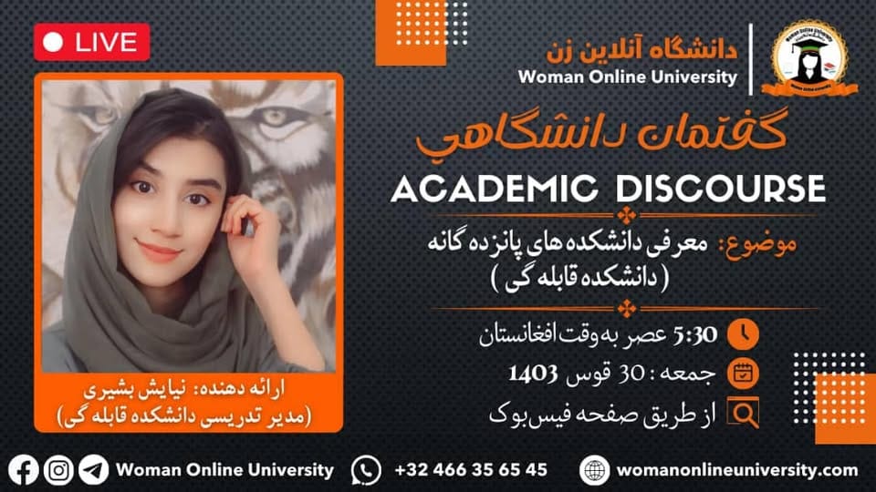 sahar joyan2024-12-21T00:41:48+00:00The Woman Online University announces an online academic discourse titled "Introduction to the Fifteen Faculties (Faculty of Nursing)." Guest Speaker: Ms. Neyayesh Bashiri (Head of the Faculty of Nursing) Date: Friday, 30,9,1403 Time: 5:30 PM Afghanistan Time 2:00 PM European Time 8:00 AM US Time Venue: Live broadcast via the Woman Online University Facebook page In this discourse, Ms. Neyayesh Bashiri will discuss about the fifteen faculties , and all students and interested individuals are invited to participate in this academic program and enhance their knowledge about the fifteen faculties of the Woman Online University. Live Broadcast Administration Online Publications [...]