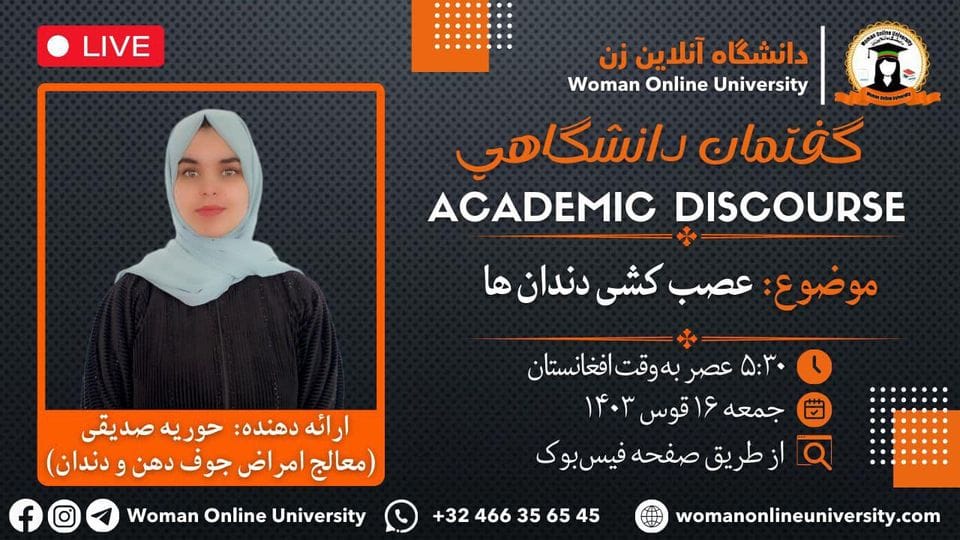 sahar joyan2024-12-09T03:45:23+00:00Date: 17,9,1403 corresponding to December 7, 2024, Location: Woman Online University Attendees: . Professor Abdul Farid Salangi (Chancellor and Founder of Woman Online University) . Professor Sohaila Erfani (Academic Deputy of Woman Online University . Professor Adeleh Zamani, Deputy for Student Affairs .professors . Members of the Leadership Team . Deans of Faculties . Department Heads . Publications Department Staff . Teaching Staff and Student Affairs Managers Achievements and Activities: 1. Conducted an academic discourse featuring Dr. Hooriya Sediqi (Oral and Dental Disease Specialist) titled "Root Canal Treatment," discussing root canal procedures and treatments for oral diseases. 2. Held an [...]