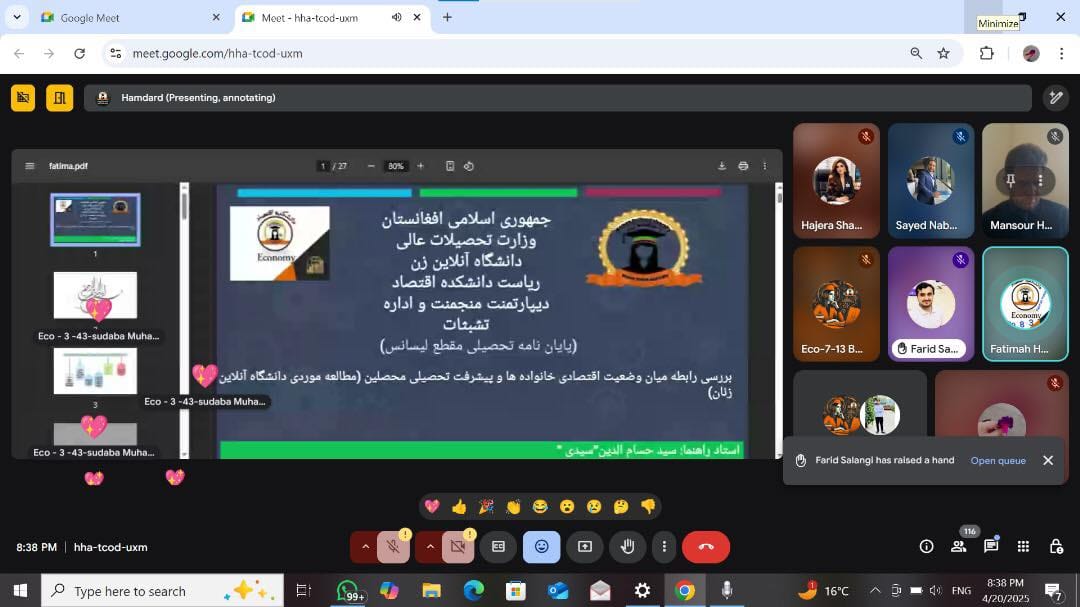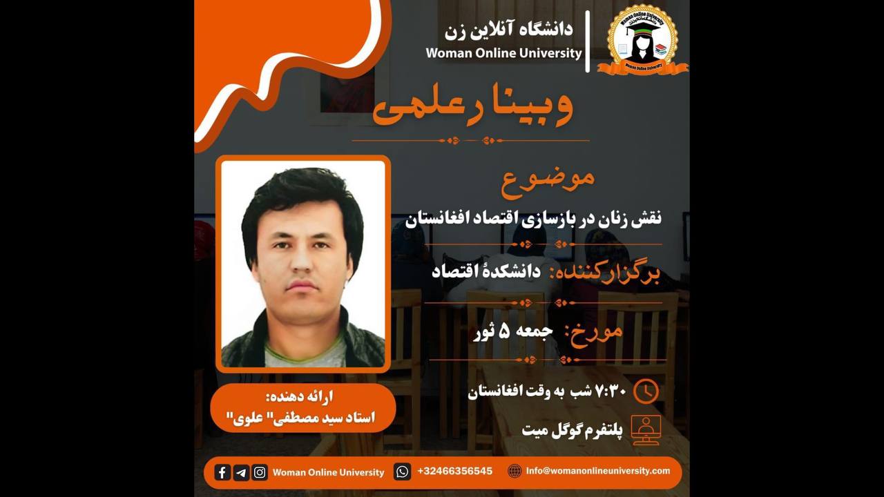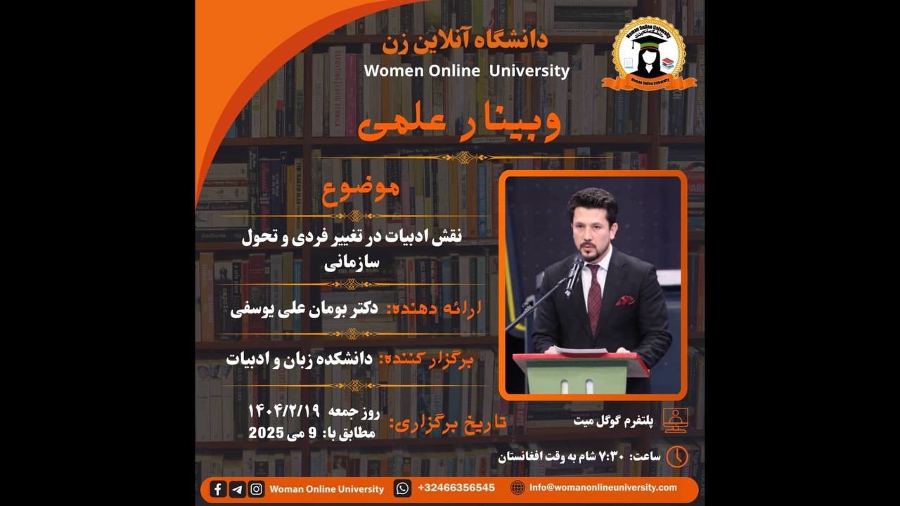 sahar joyan2025-05-16T01:38:02+00:00*وبینار علمی:* *موضوع:* نقش ادبیات در تغییر فردی و تحول سازمانی *ارائه دهنده:* داکتر بومان علی یوسفی *برگزار کننده:* دانشکده زبان و ادبیات *پلتفرم:* گوگل میت در این وبینار علمی داکتر بومان علی یوسفی در مورد نقش ادبیات در تغییر فردی و تحول سازمانی خواهد پرداخت، لذا از تمام دانشجویان و علاقمندان دعوت میشود تا در این برنامه علمی شرکت کرده و به معلومات خویش بیفزایند. *زمان برگزاری:* ۱۴۰۴/۰۲/۱۹ 2025/05/09 *در این اوقات محلی:* ساعت: 7:30 شب به وقت افغانستان ساعت: 10:00 صبح به وقت آمریکا ساعت: 4:00 بعد از ظهر اروپا ساعت: 11:30 شب به وقت آسترالیا *یادداشت:* علاقمندان [...]