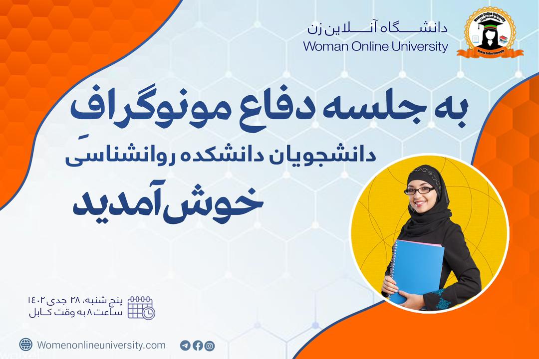 نخستین جلسه دفاع پایان نامه های(مونوگراف) محصلین دانشگاه آنلاین زن؛ تاریخ برگزاری: 28 جدی1402؛ مکان: سالون کنفرانس روم دانشگاه آنلاین زن؛ میزبان: دانشکده روانشناسی؛ دانشجویان فارغ شده دانشکده روانشناسی دانشگاه آنلاین زن طی جلسه از پایان نامه های (مونوگراف) تحصیلی شان دفاع نمودند، در این برنامه محترم پوهنیار عبدالفرید " سالنگی"، رئیس و موسس دانشگاه آنلاین زن، محترم استاد عادله"زمانی"، معاون امور محصلان و رئیس دانشکده، محترم پوهنمل استاد سهیلا [...]