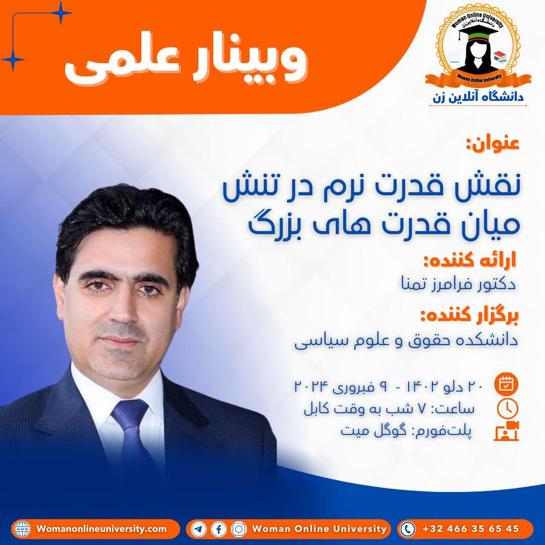 گزارش وبینار علمی: "نقش قدرت نرم در تنش میان قدرت های بزرگ"؛ تاریخ برگزاری: 20 دلو 1402؛ مکان: دانشکده حقوق و علوم سیاسی ، دانشگاه آنلاین زن؛ پلتفرم: گوگل میت؛ تعداد اشتراک کننده گان: بیشتر از 500 تن؛ وبینار علمی با عنوان "نقش قدرت نرم در تنش میان قدرت های بزرگ" توسط دانشکده حقوق و علوم سیاسی، دانشگاه آنلاین زن برگزار شد. در ابتداء محترم پوهنیار عبدالفرید "سالنگی"رئیس و [...]
