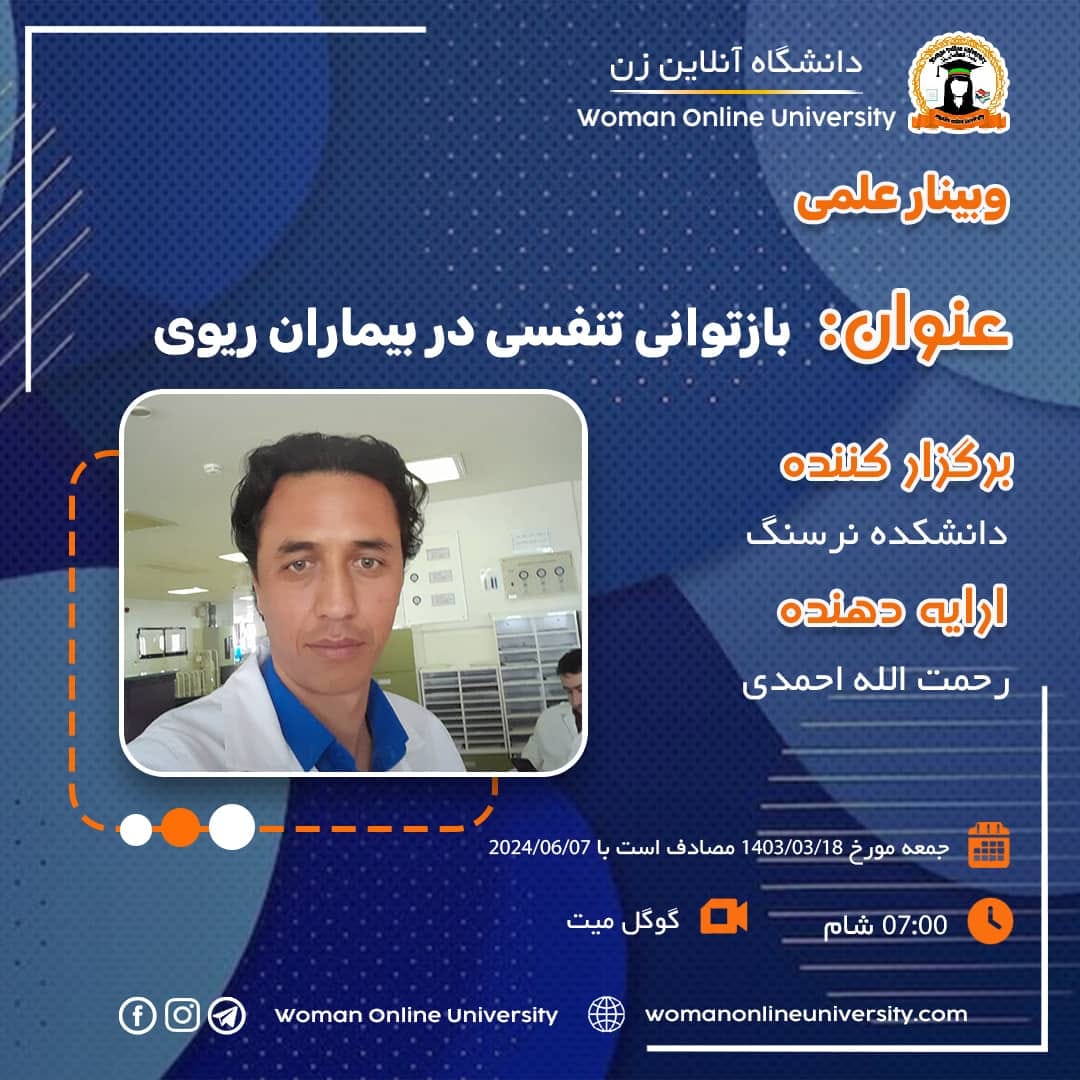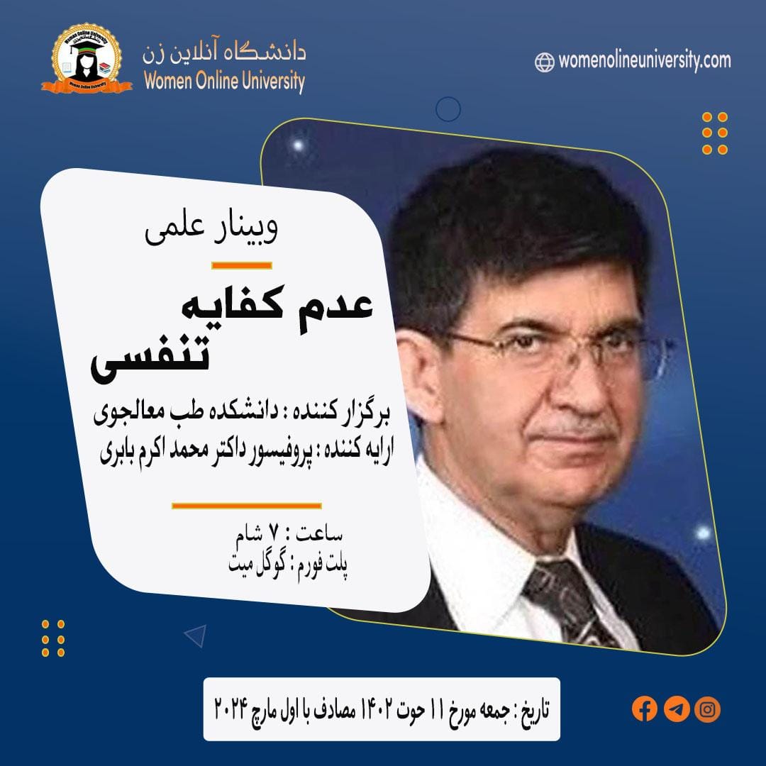 Report of the Academic Webinar titled "Respiratory Insufficiency" Organizer: The Faculty of Theraputic Medicine, Woman Online University; Platform: Google Meet An academic webinar titled "Respiratory Insufficiency" was held on 1/03/2024 by the faculty of Therapeutic Medicine of the Woman Online University. At the beginning, Ms. Adela Zamani, the Deputy-chancellor of Student Affairs at Woman Online University, welcomed the distinguished guests, including: - Dr. Professor Mohammad Akram "Baburi", [...]
