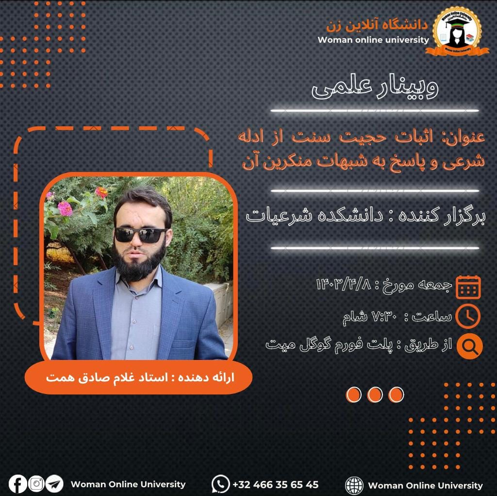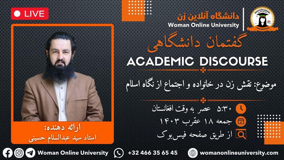 Academic Discourse The Woman Online University holds online academic discourse titled "The Role of Women in Family and Society from an Islamic Perspective." Guest Speaker: Professor Sayed Abdul Salam Hosaini Date: 🗓 Friday, 18,8,1403 ⏰ 5:30 PM Afghanistan Time 3:00 PM Europe Time 11:00 AM America Time Venue: Live broadcast via the Woman Online University Facebook page In this discourse, Professor Sayed Abdul Salam Hosaini will discuss "The Role [...]
