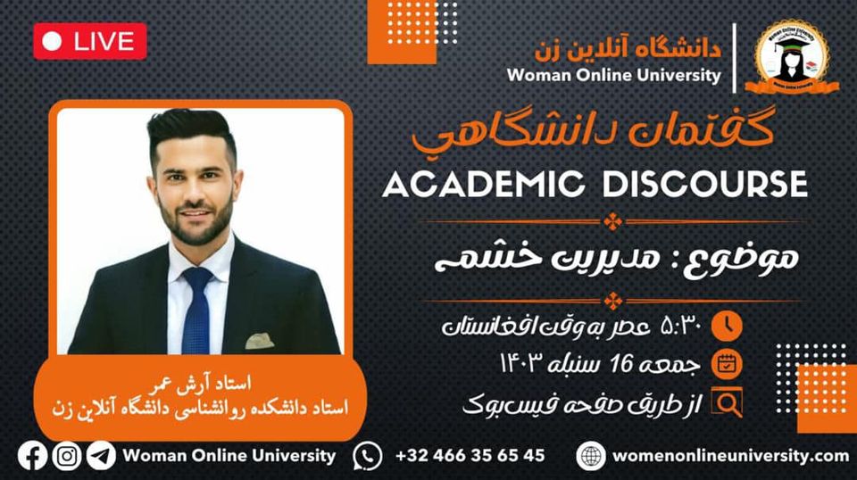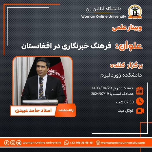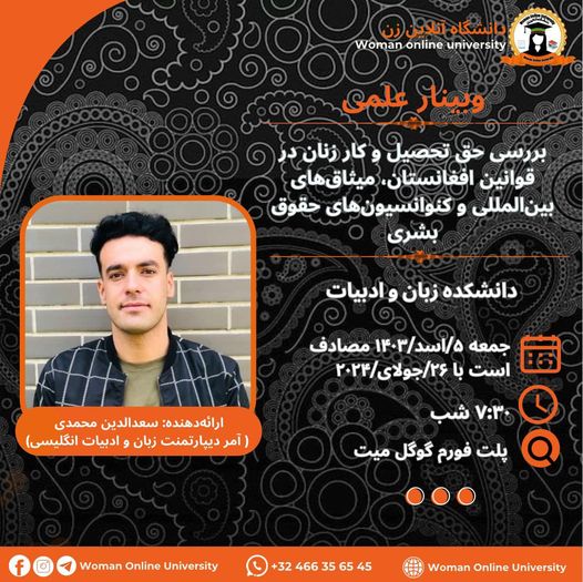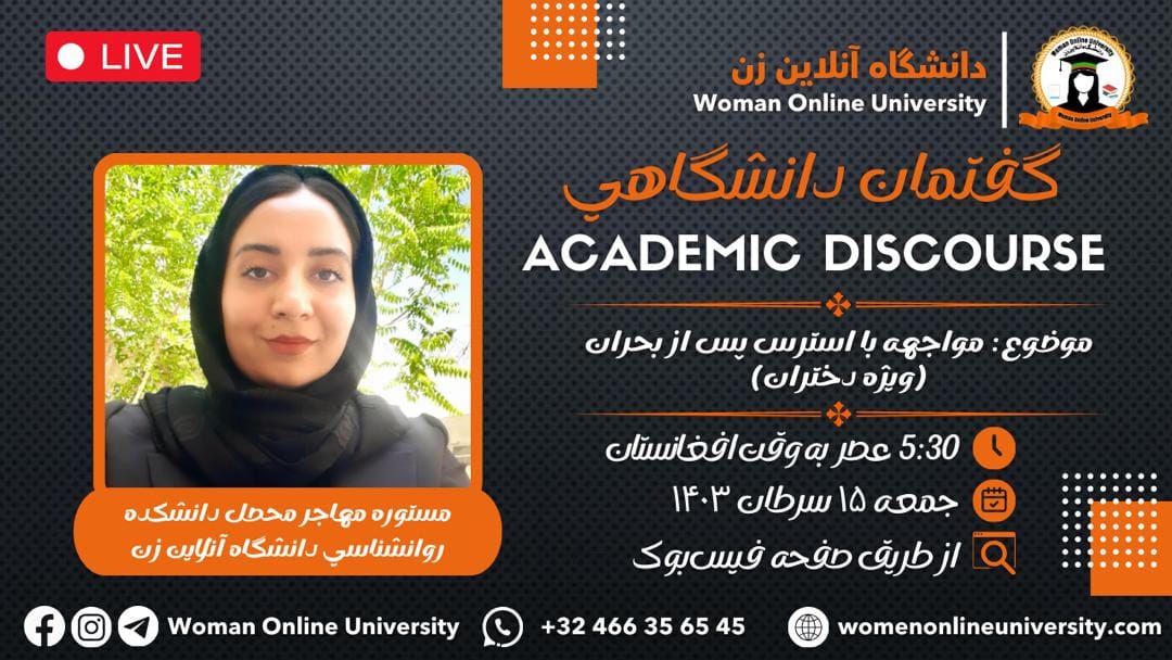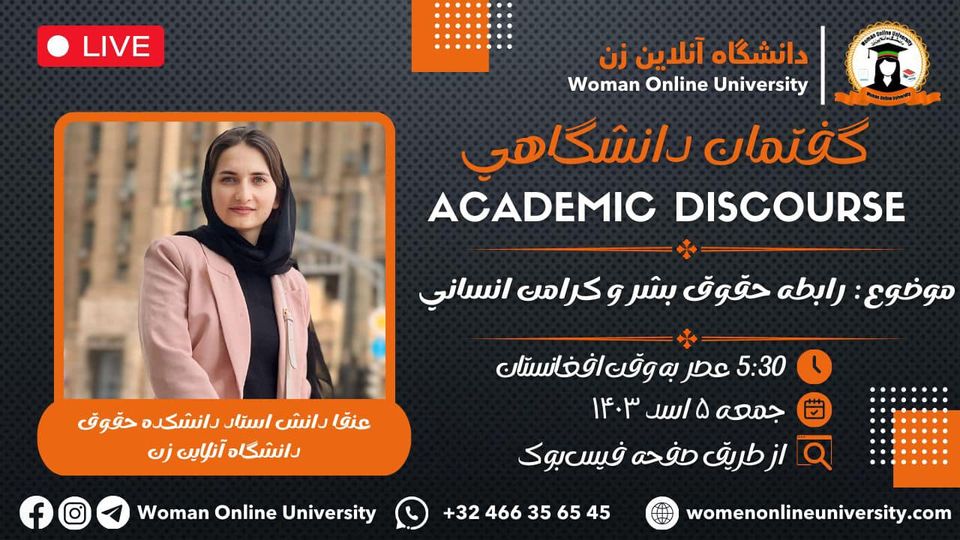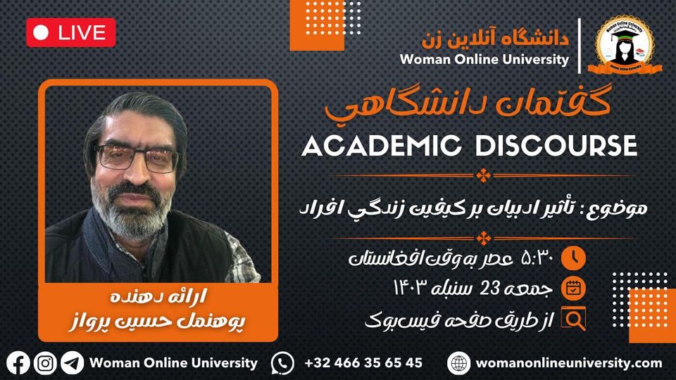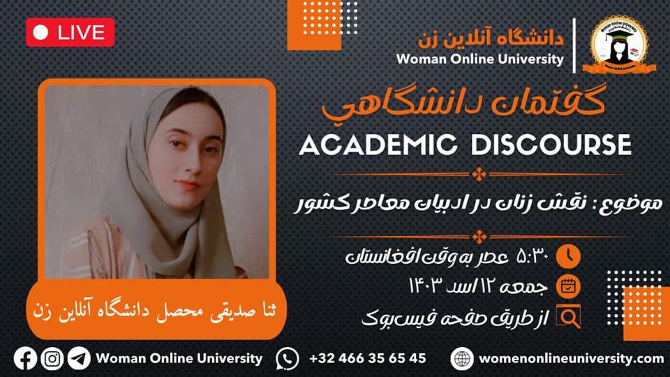 The Woman Online University announces that it will hold an online academic discourse titled "The History of Language Creation and Its Role in Human Communication." Guest Speaker: "Professor Sadudin Mohammadi, Dean of the Faculty of Language and Literature" Time: 🗓 Friday, 13,7,1403 ⏰ 5:30 PM Afghanistan Time 3:00 PM Europe Time 11:00 AM USA Time Venue: 📌 Facebook Social Network of the Woman online University In this discourse, "Professor [...]