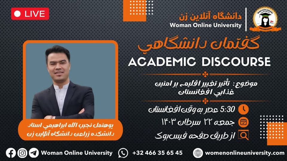 The Woman Online University proudly announces that it will hold an online academic discourse titled "Causes and Factors of Land Degradation in Afghanistan." Guest of the Program: Professor Farzana Razmjo, Dean of the Faculty of Agriculture at the Woman Online University. Time: 🗓 Friday, 6, 30, 1403 ⏰ 5:30 PM Afghanistan Time 3:00 PM Europe Time 8:30 AM USA Time Venue: 📌 Facebook Social Network of the Woman online [...]