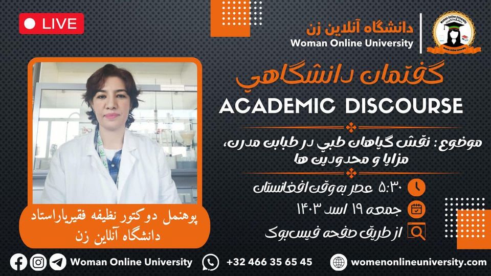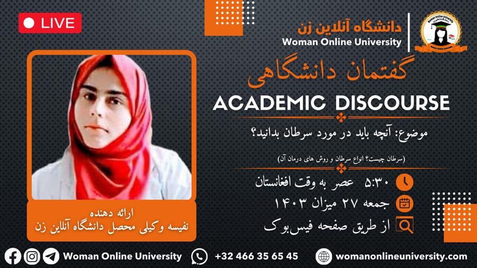 Women Online University is proud to announce the online academic discourse titled "What is Cancer Types of Cancer and its Treatment Methods." Guest Speaker: Ms. Nafisa Wakili, a student at the Woman Online University Date: 🗓 Friday, 27, 7, 1403 ⏰ Time: 5:30 PM Afghanistan time 3:00 PM Europe time 11:00 AM USA time Venue: 📌 Facebook Social Network of the Woman online University In this discourse, Ms. Nafisa [...]