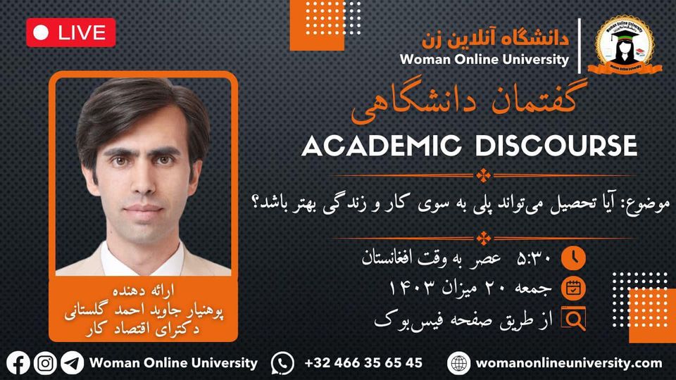 دانشگاه آنلاین زن با افتخار اعلام میدارد که برنامه آنلاین گفتمان دانشگاهی با عنوان《آیا تحصیل میتواند پلی به سوی کار و زندگی بهتر باشد؟》 را برگزار میکند. مهمان برنامه پوهنیار جاوید احمد گلستانی دکترای اقتصاد کار زمان: جمعه ۲۰ میزان ۱۴۰۳ ۵:۳۰ عصر به وقت افغانستان ۳:۰۰ به وقت اورپا ۱۱:۰۰ به وقت آمریکا محل برگزاری: پخش زنده از طریق صفحه فیسبوک دانشگاه آنلاین زن در این گفتمان " [...]