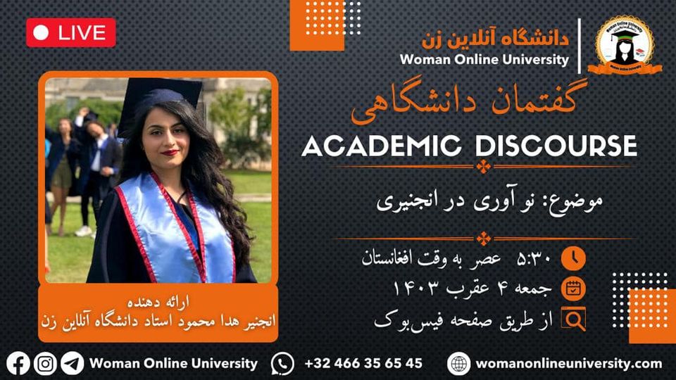 The Woman Online University announces academic discourse titled "Innovation in Engineering." Guest Speaker: Engineer Hoda Mahmood, Professor at the Woman Online University Date and Time: 🗓: Friday, 4,8,1403 ⏰: 5:30 PM Afghanistan Time Venue: Live broadcast via the Woman Online University Facebook page. In this discourse, "Engineer Hoda Mahmood, Professor at the Woman Online University," will discuss "Innovation in Engineering." Therefore, all students and interested individuals are invited [...]
