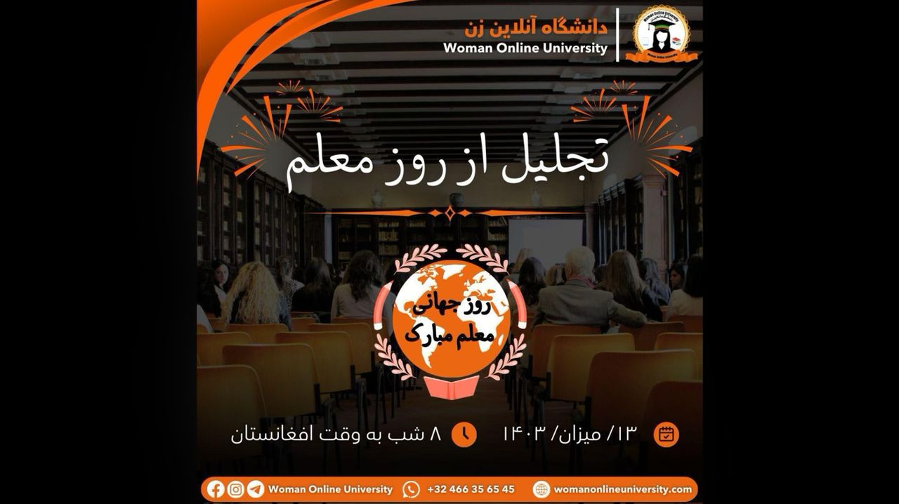 برنامه ویژه به مناسبت (تجلیل ازمقام و روز معلم)؛ دانشگاه آنلاین زن به مناسبت روز جهانی معلم، افتخار دارد که از تلاشها و زحمات بیپایان معلمین گرامی تجلیل نماید. معلمین، چراغهای دانش و آگاهی هستند که با عشق و فداکاری، آیندهسازان جامعه را پرورش میدهند. • میزبان: ریاست تصدی نشرات؛ • زمان برگزاری: جمعه ۱۳ میزان ۱۴۰۳؛ در این اوقات محلی: • ساعت: ۸ شب به وقت افغانستان؛ • [...]