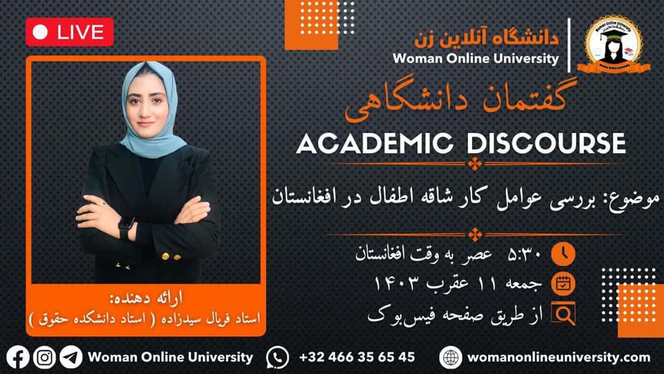 The Woman Online University announces academic discourse titled "Causes of Child Labor in Afghanistan." Guest Speaker: Professor Faryal Sayedzada professor at (Faculty of Law) Woman Online University Date: 🗓 Friday,11,8,1403 Time: ⏰ 5:30 PM Afghanistan Time 3:00 PM European Time 08:30 AM American Time Venue: Live broadcast via the Woman Online University Facebook page In this discourse, "Professor Faryal" will discuss "Causes of Child Labor in Afghanistan" Therefore, all [...]
