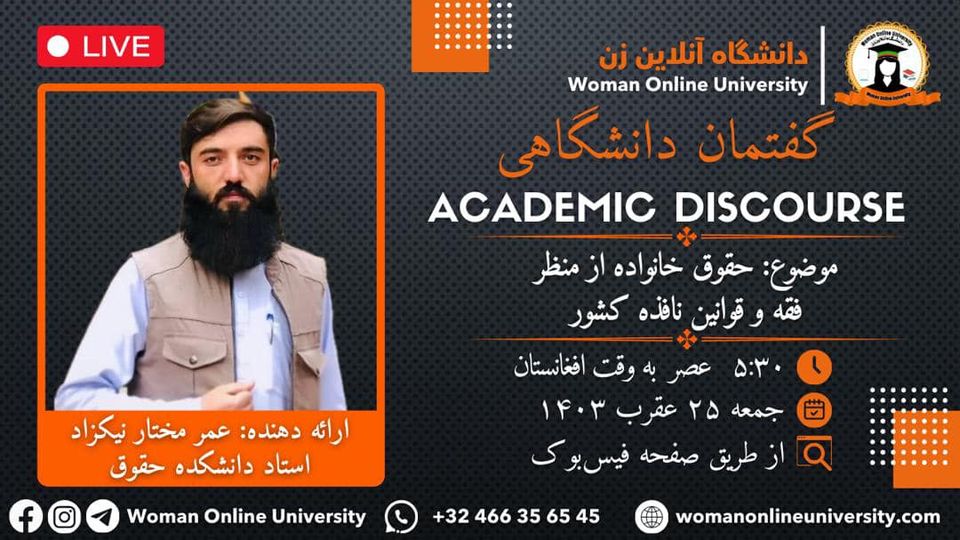 دانشگاه آنلاین زن با افتخار اعلام میدارد که برنامه آنلاین گفتمان دانشگاهی تحت عنوان《حقوق خانواده از منظر فقه و قوانین نافذه کشور》 را برگزار میکند. *مهمان برنامه:* محترم عمر مختار نیکزاد استاد دانشکده حقوق و علوم سیاسی *زمان:* جمعه ۲۵ عقرب ۱۴۰۳ ۵:۳۰ به وقت افغانستان ٢:٠٠ به وقت اورپا ٨:٠٠ به وقت آمریکا *محل برگزاری:* پخش زنده از طریق صفحه فیسبوک دانشگاه آنلاین زن در این گفتمان " [...]