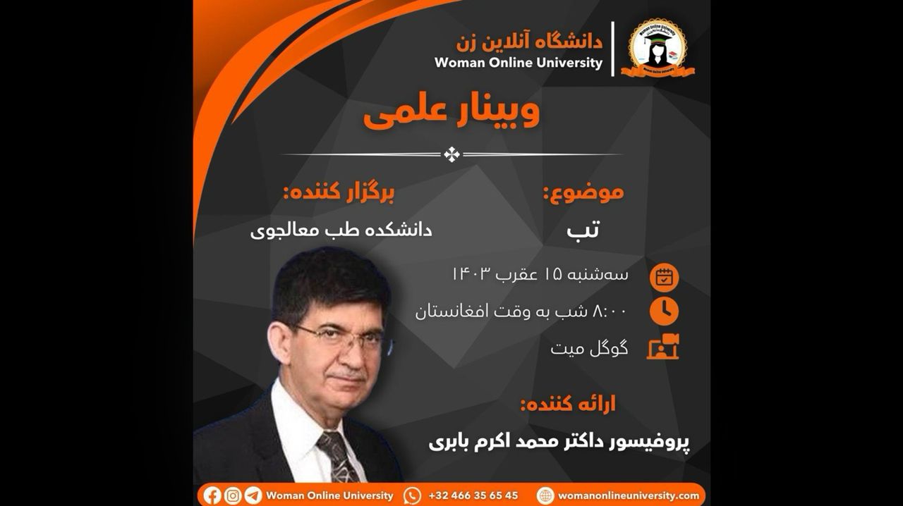 Organizer: Faculty of Nursing Woman Online University Date: 4 ,8 ,1403 (October 25, 2024) Time: 7:30 PM Afghanistan Time 11:00 AM USA Time 5:00 PM Europe Time Platform: Google Meet Presenter: Dr. Mohammadullah Bayat A "Gastroenterologist" from the country This webinar will explore key points regarding nutrition during pregnancy. The importance of proper nutrition for the health of both mother and fetus, essential nutrients, and practical dietary recommendations [...]