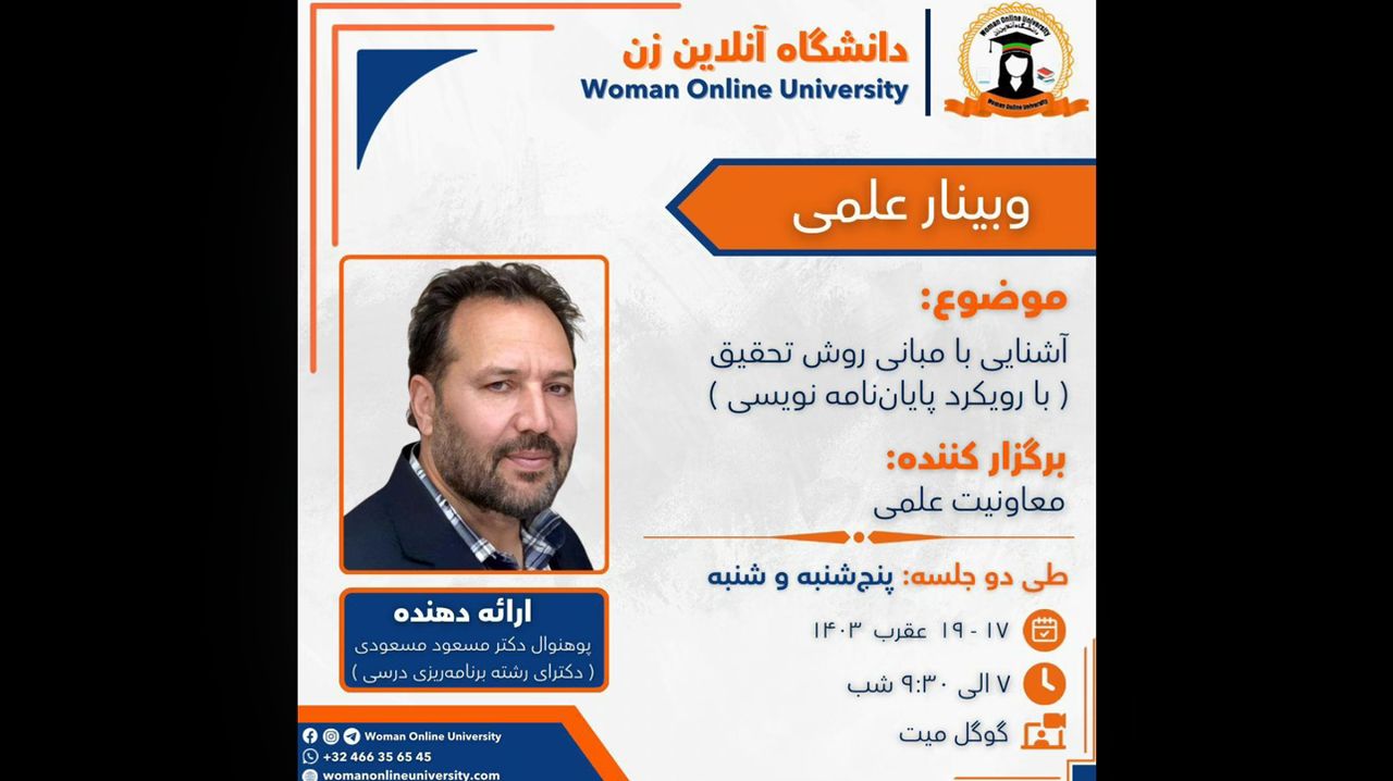 وبینار علمی: موضوع: آشنایی با مبانی روش تحقیق( با رویکرد پایاننامه نویسی) ارائهدهنده: پوهنوال دکتر مسعود مسعودی( دکترای رشته برنامهریزی درسی) برگزار کننده: معاونیت علمی پلتفرم: گوگل میت اهداف وبینار: 1. آشنایی با اصول روش تحقیق: یادگیری مفاهیم پایهای روش تحقیق. 2. دانستن مراحل تحقیق: آشنایی با مراحل مختلف تحقیق، از انتخاب موضوع تا تحلیل دادهها. 3. نوشتن پایاننامه: یادگیری تکنیکهای نوشتن یک پایاننامه منظم و علمی. گاه: روزهای [...]