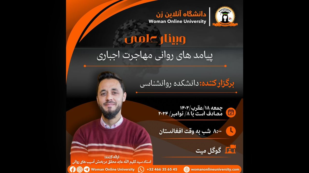 وبینار علمی: موضوع: پیامد های روانی مهاجرت اجباری ارائه دهنده: داکتر سید کلیم الله عابد ( روانشناس و محقق) برگزار کننده: دانشکده روانشناسی پلتفرم: گوگل میت اهداف وبینار علمی "پیامدهای روانی مهاجرت اجباری": 1. آگاهیبخشی: افزایش آگاهی شرکتکنندگان در مورد پیامدهای روانی ناشی از مهاجرت اجباری و تأثیرات آن بر افراد و خانوادهها. 2. تحلیل تجربیات: بررسی تجربیات واقعی مهاجران اجباری و چالشهایی که با آنها مواجه هستند، به [...]