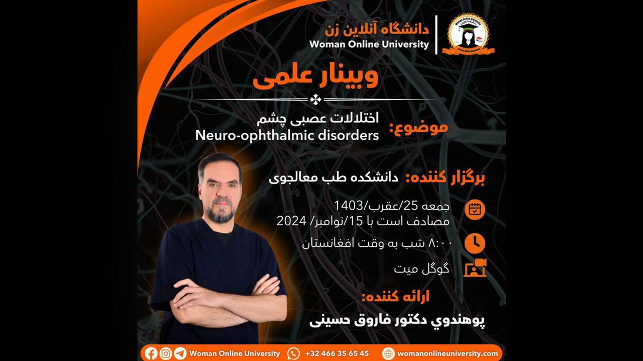Woman Online University Presents: Academic Webinar Titled: Neurological Eye Disorders Presenter: Dr. Farooq Hussaini Organizer: Faculty of Medical Science Platform: Google Meet In this webinar, Dr. Farooq Hussaini will discuss "Neurological Eye Disorders." Therefore, all students and interested individuals are invited to participate in this Academic program and enhance their knowledge about "Neurological Eye Disorders." At the following local times: 8:00 PM Afghanistan Time 11:30 AM USA Time 5:30 [...]
